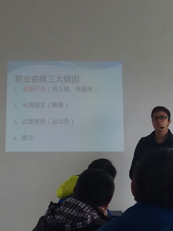 潘老師風(fēng)趣幽默的講課讓培訓(xùn)氣氛很愉快,員工們都聽得很認真,在培訓(xùn)中學(xué)習(xí)到了不少健康知識,其中對于職業(yè)病的防治,尤其是肩部和腰部,與老師進行了很多互動。